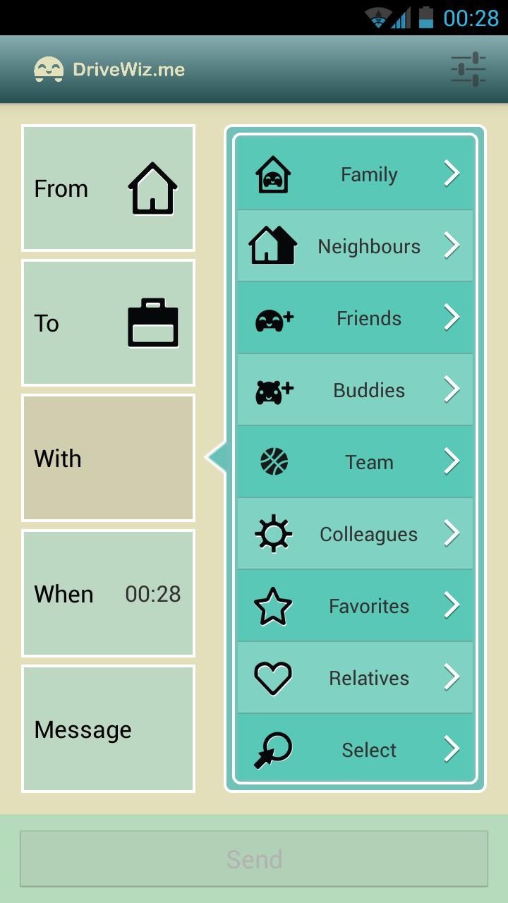 باستخدام DriveWiz.me ، ما عليك سوى اختيار الوجهات ذات الصلة "من" أين و "إلى" حيث ستذهب ، واختر المجموعة "مع" الذي ستذهب إليه ، ودفع "إرسال". ستقوم DriveWiz.me ببناء رسالة نصية محددة مسبقًا للإرسال إلى الهواتف المحمولة لكل شخص في المجموعة المحددة. يمكنك أيضًا ضبط وقت السفر وتعديله برسالة مناسبة.