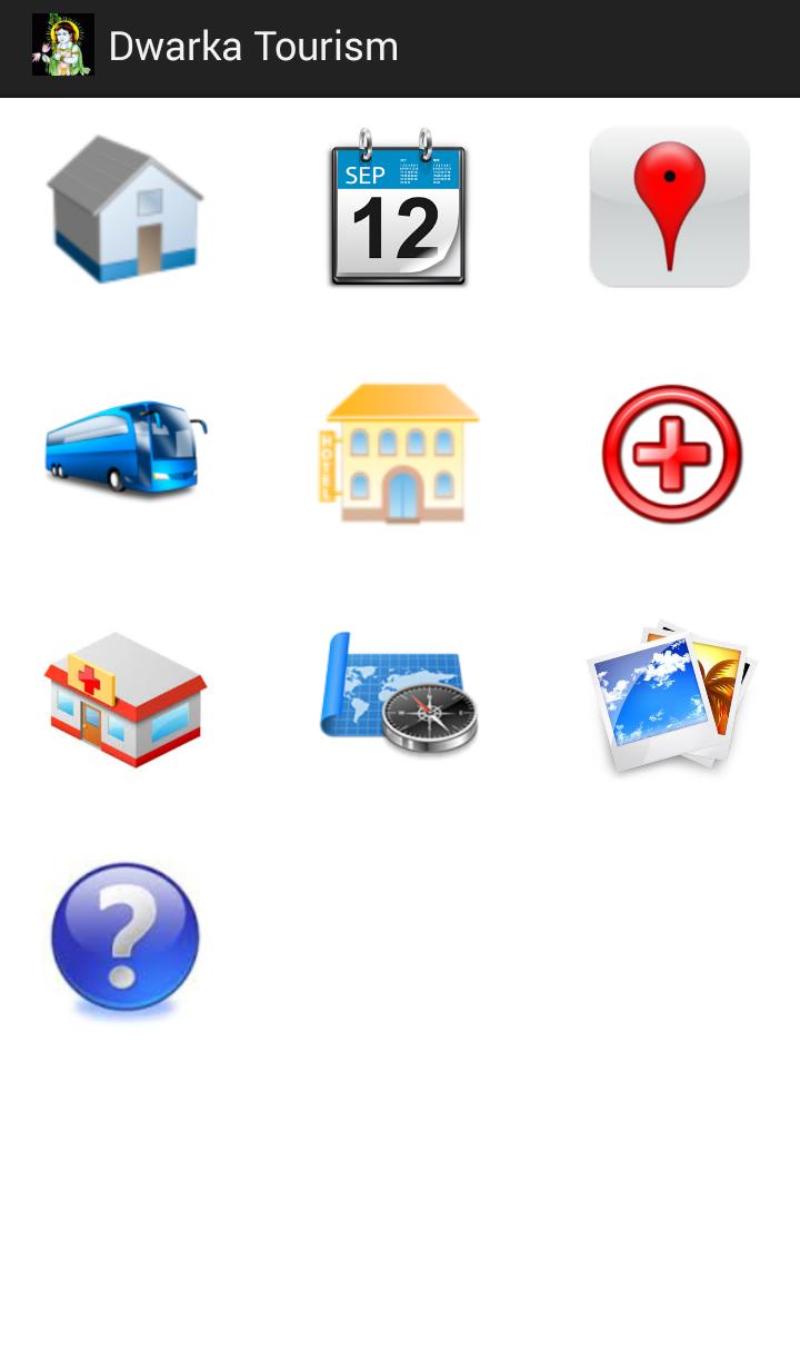 وتوفير تفاصيل عن الأماكن السياحية (الفئات إلى جزأين في مكان داخل المدينة والمكان خارج المدينة) ، توقيت المعبد (توقيت الصباح وتوقيت المساء) ، المستشفيات ، المتاجر الطبية ، خرائط ، معرض مدينة دواركا (اللورد كريشنا أو دواركاده).