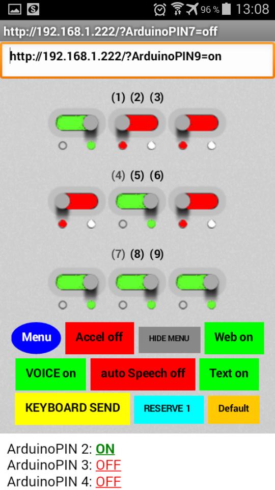 With "Android devices" over Wi-Fi Url send commands to the Arduino, enable / disable the corresponding Pins on the Arduino.