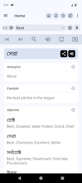 Bangla <> English Dictionary offline and free. You can search both English and Bangla words. You can search words directly from "Internet Browser" or other Applications by using Sharing option. In the sharing option you will find "Bangla Dictionary" and choosing "Bangla Dictionary" will open the dictionary with the shared word so you need not type. Exiting from the dictionary will return you to "Internet Browser" or other Applications again. This is not only a Dictionary but also a learning tool. You can use this dictionary when you have no Internet connection. MCQ (Multiple Choice Question) option is available. There is autosuggestion so you need not type full words. You also can use Speech to text feature. You can add words to the study plan and remove words from the study plan. When you start typing, you will see some words starting with the letters you typed. The dictionary searches in a database for the matching words. This can slow down typing in small handsets. Therefore in settings there is an option to turn that off. So low profile mobile handsets can turn off Auto search to type quickly. You will see a Dictionary icon on the notification bar to start the app quickly. On sharing text you will find the Bangla Dictionary. This will be helpful to find out the meaning of any word.