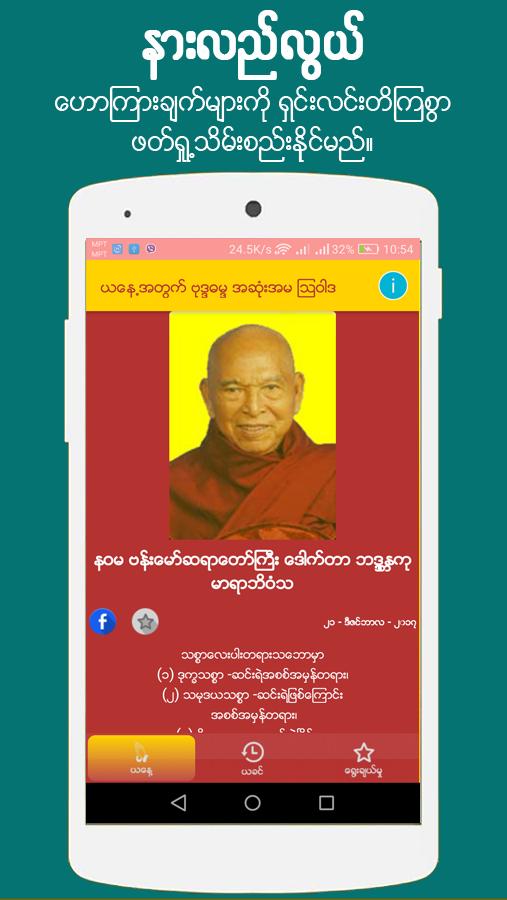 Buddha Dhamma is the one and the first application about clear explanation of Buddha's sermons by some of the most respectful monks in Myanmar. In this application, Buddha's sermons which are written in PALI language are translated by monks in Myanmar language as daily notes. Buddhists are recommended to try out this application. Who knows it might make your day after reading a daily note?