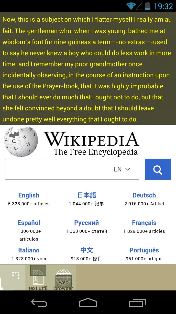 Change audio tracks. Listen audio, read Text Utf-8, Html and browse the web at the same time. Auto-scroll text, html, and web pages. Configure auto-scrolling speed. Configure modules’ opacity – place them one over another, and read with a photos/video background. Set photos in slideshow mode. Use explorer to browse and manipulate files and directories.