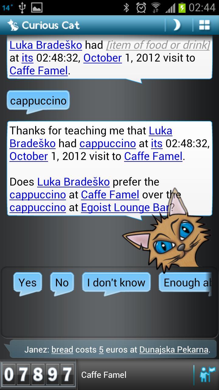 Curious Cat is an AI that wants to learn to make your life better. You and your friends answer its questions about your world; it uses what it learns to try to find better places to go and things to do. It won't just suggest a coffee shop - it'll find one plays the music you like, and serves a great carrot cake (one of your favorites).
