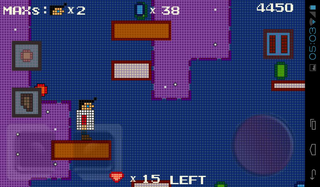 Dangerous Max is a classic side scroller in old DOS game style. Dangerous Dave mixes game mechanics of old Nokia Classic Bounce and 90s DOS classics Dangerous Dave and Commender Keen. In this adventure help Max to find legendary green diamond.Explore different levels to collect red diamonds to reach next levels. Get power ups to overcome obstacles and defeat various enemies.