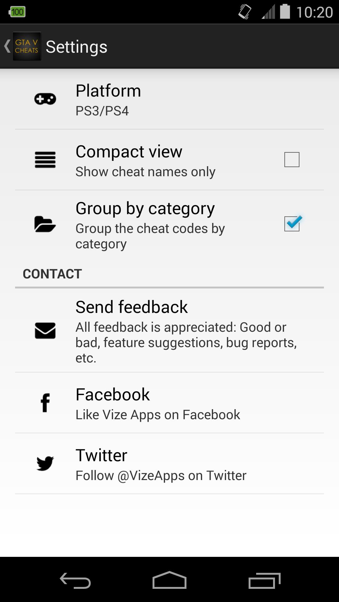 Derzeit sind alle 31 Cheat -Codes für GTA V erhältlich. Diese App hat die Möglichkeit, die Cheats nach Kategorie zu gruppieren (Spieler, Gegenstände, Fahrzeuge, Welt).