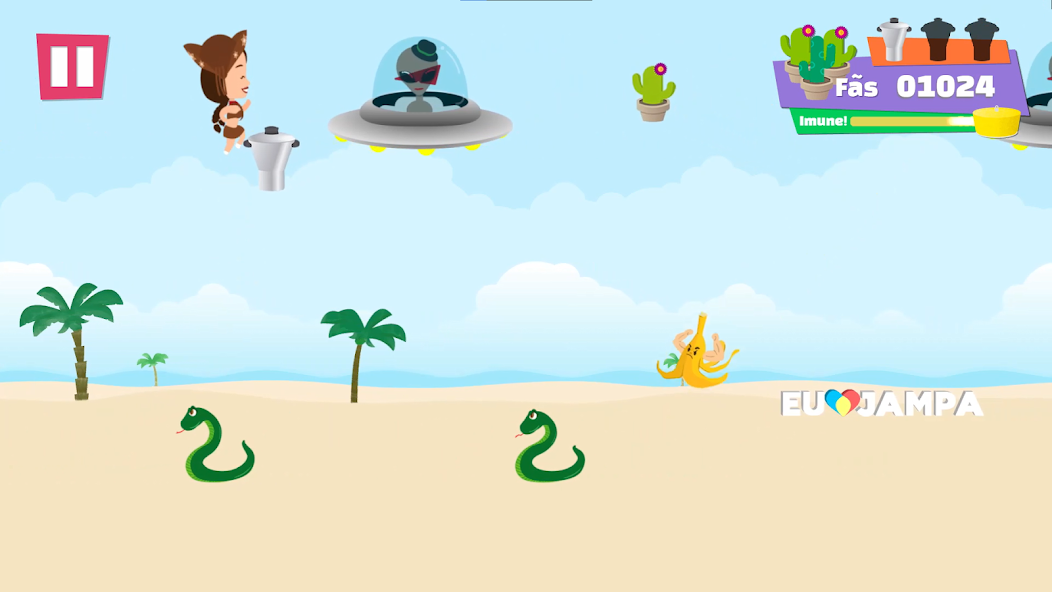 Ihre Mission ist es, das Fandom von Juliette zu erhöhen (noch mehr? Aus!). Laufen Sie ununterbrochen und schneller und schneller, weiche Feinde aus und springen Sie die Wände, während Sie Kakteen und Couscous auf dem Weg sammeln! Juliette ist imamune, aber wenn sie nicht ausgeht und die Situation Arbeit bekommt, können Sie mit den Couskuzeiras auf Ihren Gegnern sprechen! Dieses kleine Spiel ist Txurubei, Txurubai!