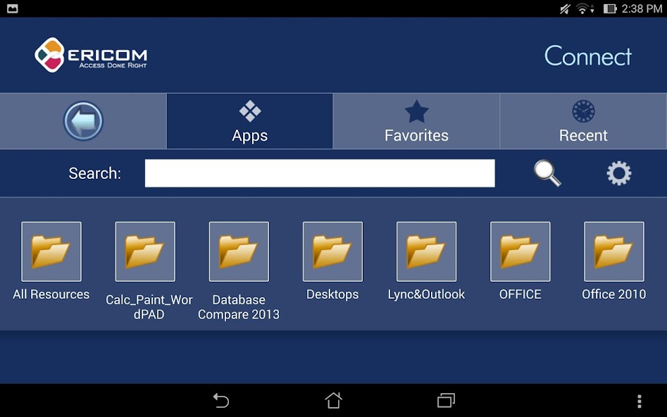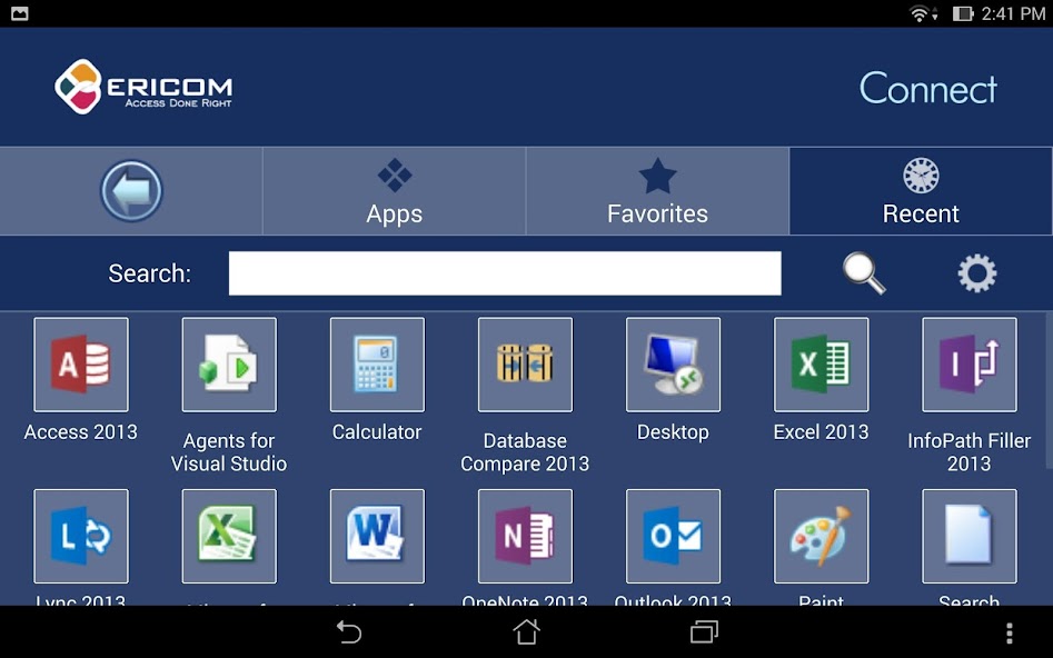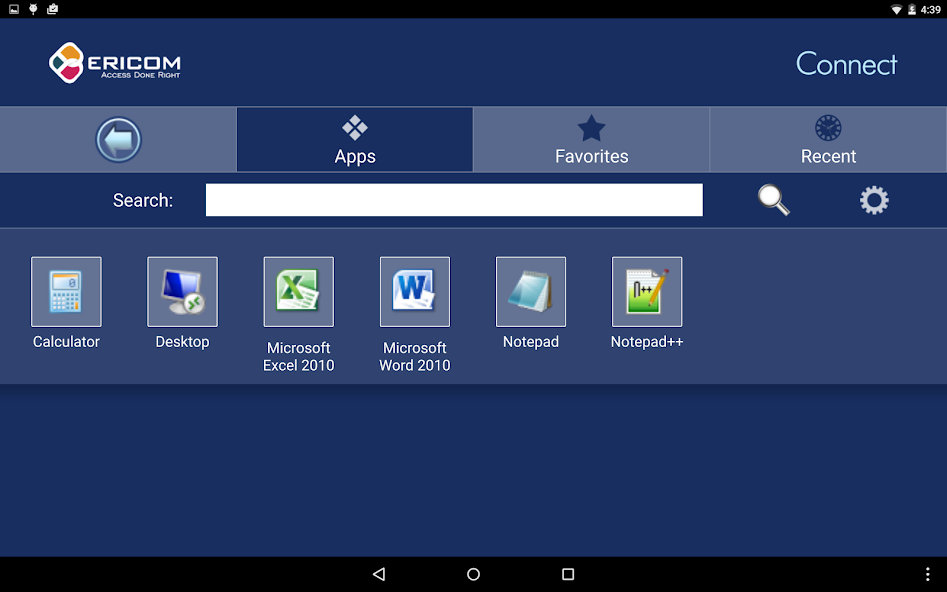 Ericom Connect Mobile client provides quick, easy and secure mobile access to centrally published and managed Windows desktops and applications hosted on Terminal Services, RDS, virtual desktops, and physical PCs. Access your office PC and Windows apps (e.g., Word, Excel, Acrobat and other business applications) from Android devices.