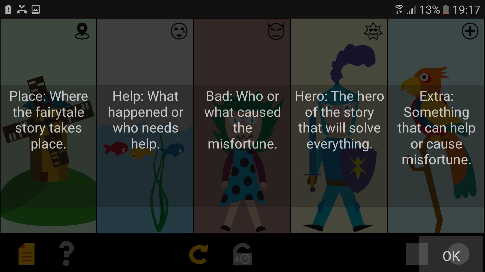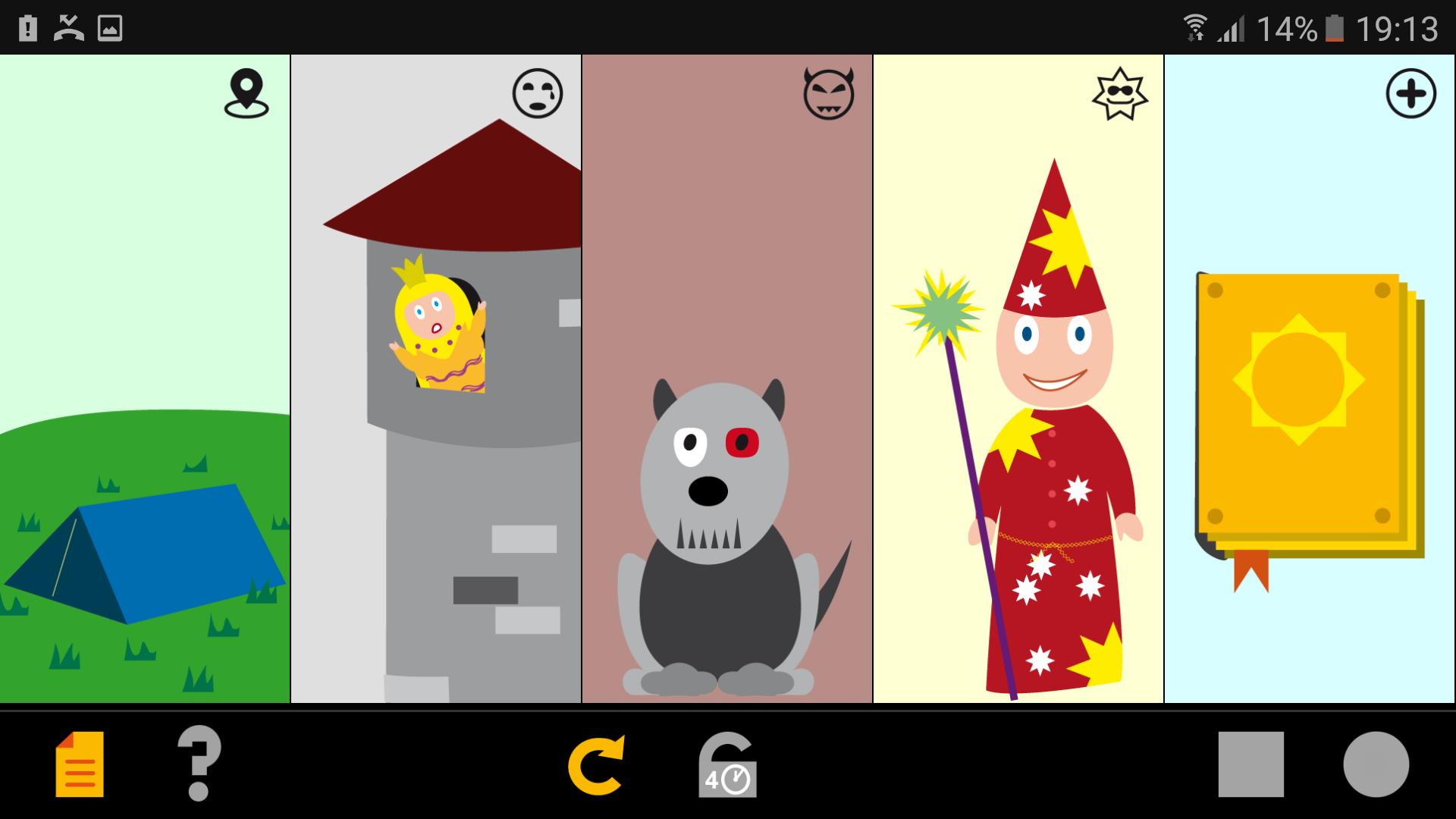 Divertida narración basada en imágenes seleccionadas al azar. La aplicación selecciona imágenes y, según estas imágenes, usted o su hijo contarán la historia. Por Combine Pictures, aprenderá más de 1000 Fairy Tales . Cada cuento de hadas puede ser corto o largo, pero siempre será diferente. Depende solo de tu imaginación.