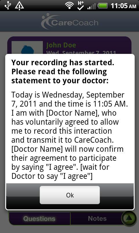 CareCoach es la mejor aplicación para mejorar la atención médica donde más importa: cuando habla con sus médicos. Los pacientes registran visitas al médico, se guía a hacer preguntas a su médico, recopilar información y compartir grabaciones de consultorio médico con familiares o cuidadores en un sitio web seguro, CareCoach .com. El programa seguro le permite reunir el poder de un equipo de cuidado: un grupo de amigos, familiares o asesores en los que confía. Puede buscar su consejo o simplemente dejarlos escuchar lo que el médico le dijo. Ideal para familias que viajan o viven a una distancia entre sí.