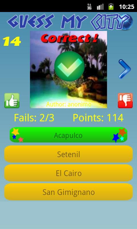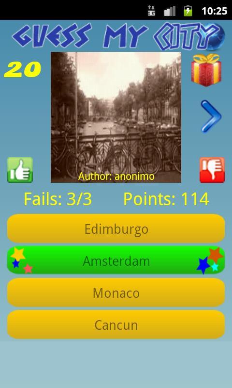 Guess My City es un juego de preguntas y respuestas de trivia, en el que debes llegar a la ciudad que se muestra a la imagen de cuatro respuestas posibles. Puede elegir entre tres tipos de dificultad: Ciudades fáciles, medianas y duras, y seleccionadas en todo el mundo, o simplemente en su país (el país y el idioma se detectan automáticamente desde su teléfono inteligente).
