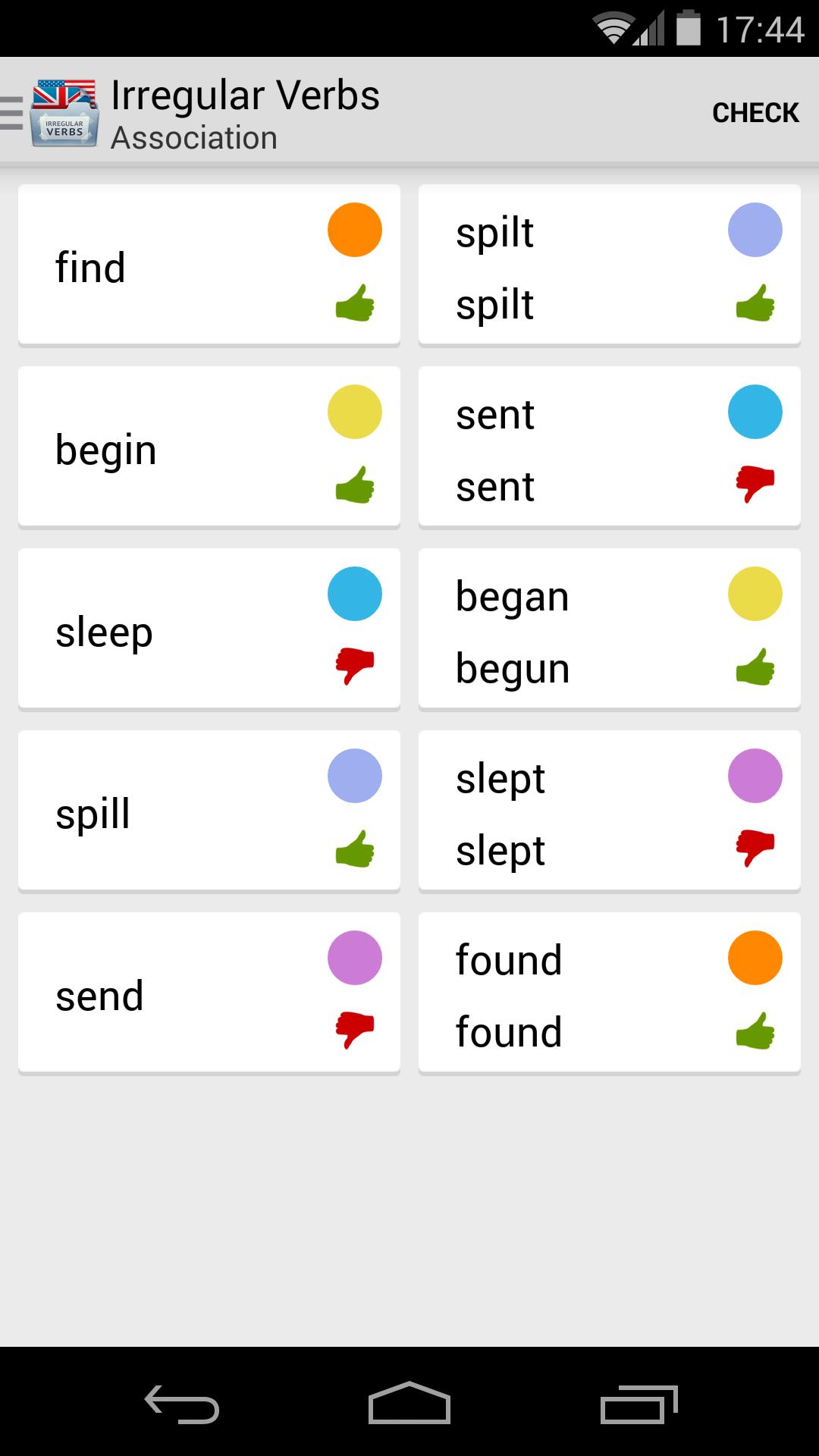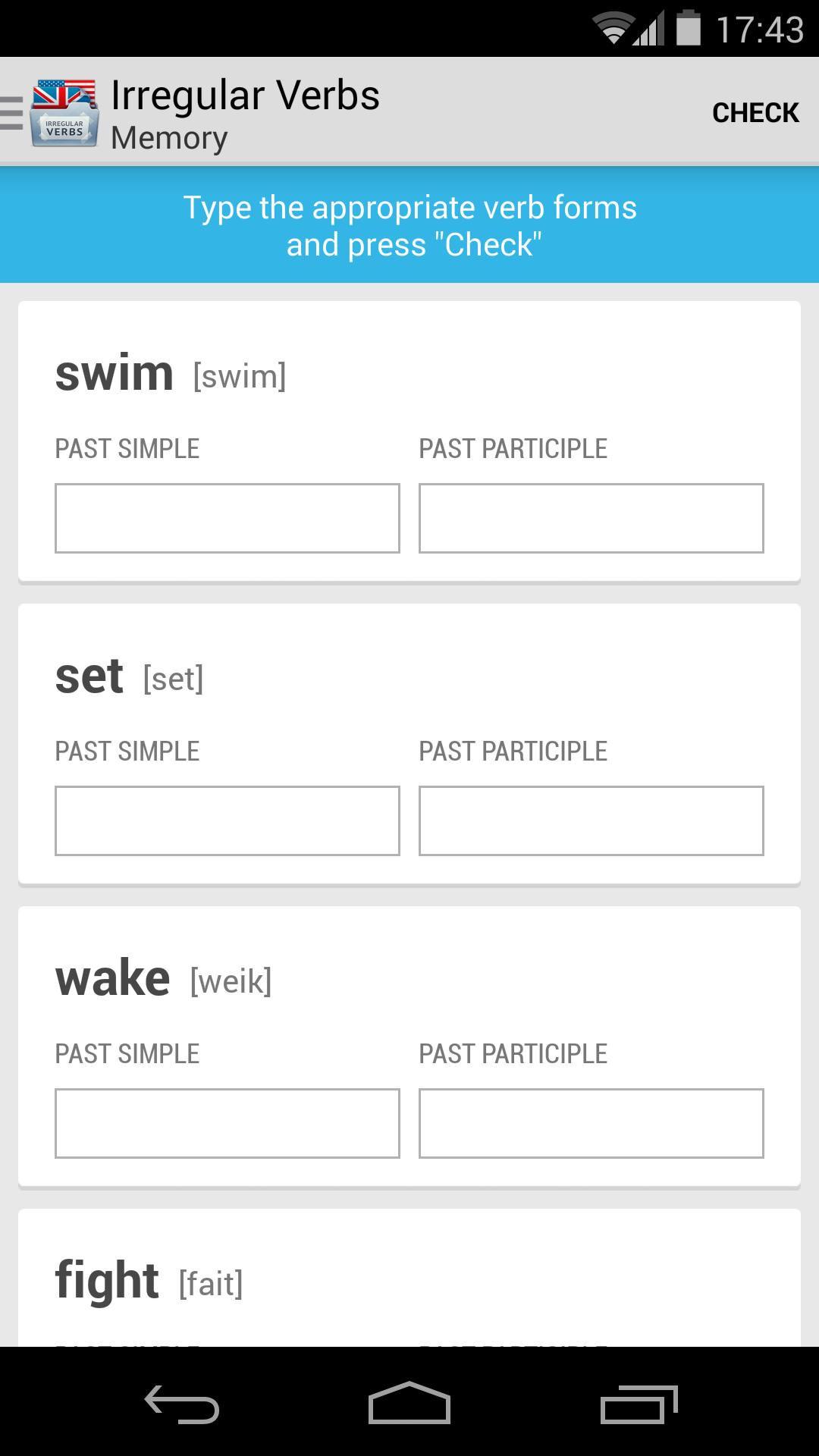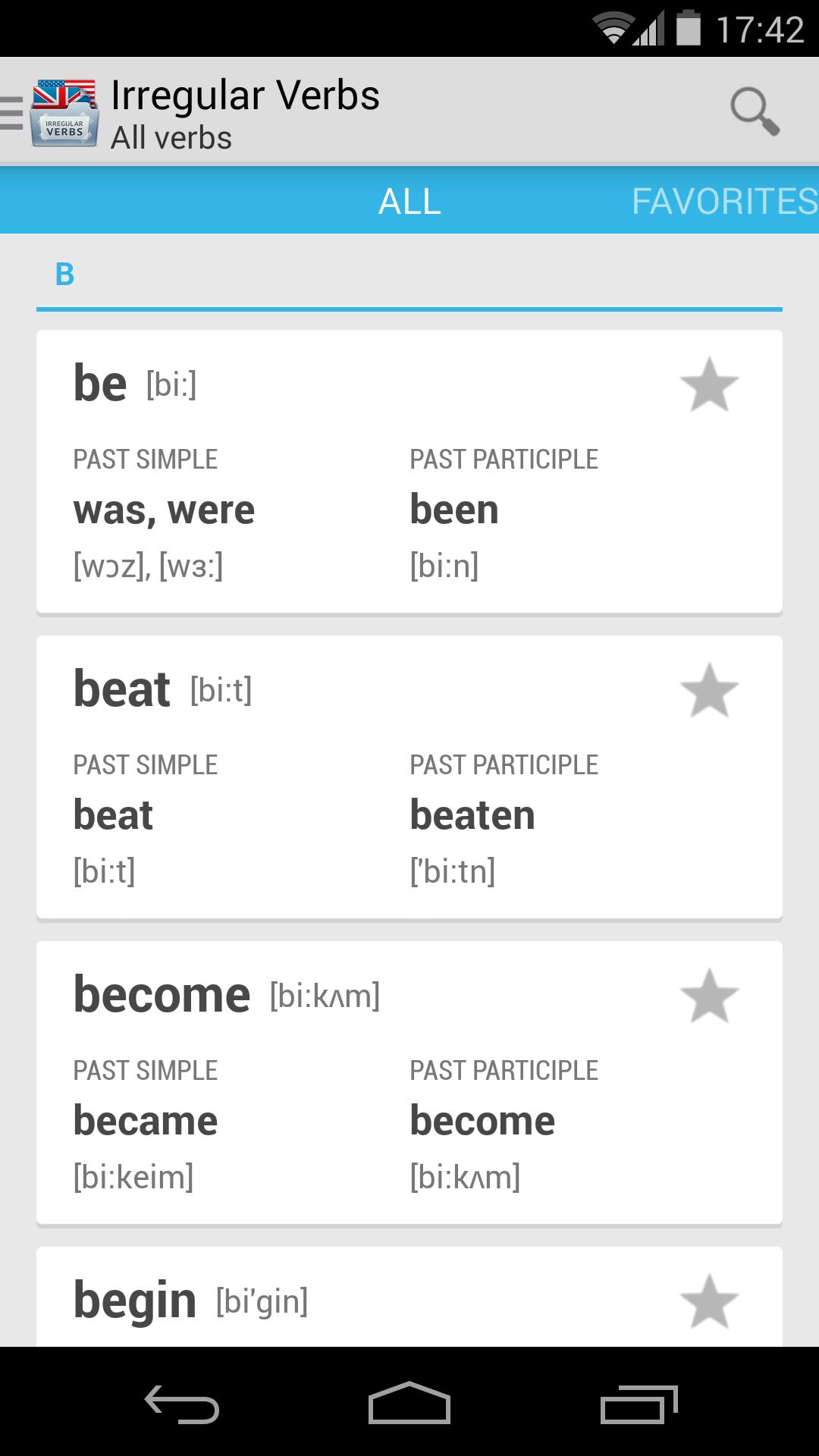Su asistente para aprender verbos irregulares en inglés. La aplicación contiene dos tipos de ejercicios para aprender los verbos irregulares más populares. Para cada forma del verbo tiene transcripción.