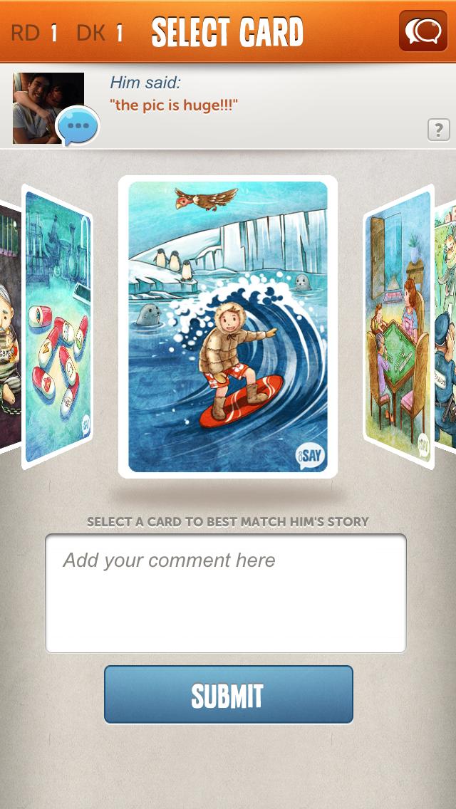 Tómelo a su vez para decir algo, inspirándose en una de sus cartas. Lo que dices podría ser original o podría incorporar letras de canciones, títulos de películas y frases comunes. Otros jugadores seleccionarán una carta que sienten los mejores partidos de lo que has dicho y estas cartas, junto con las tuyas, serán barajadas y reveladas. ¿Todos sabrán la identidad de la tarjeta original o sus amigos podrán engañarse mutuamente?