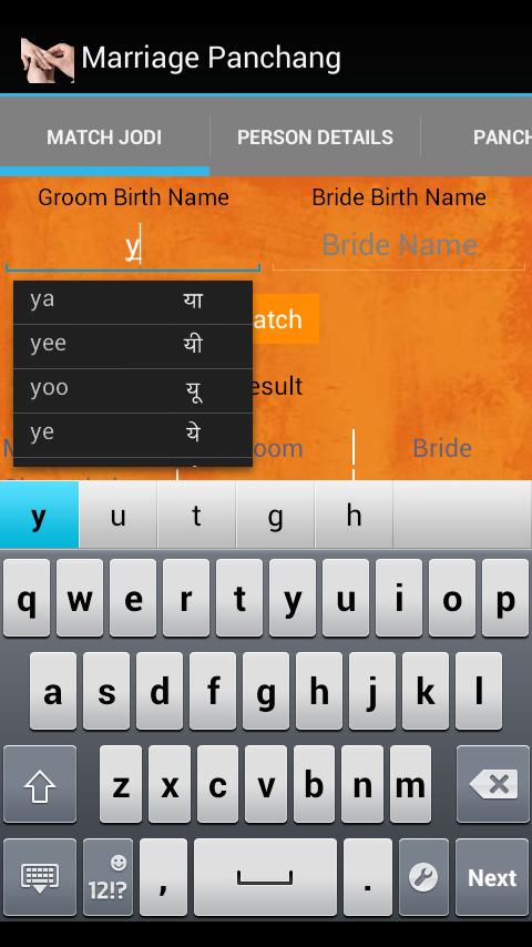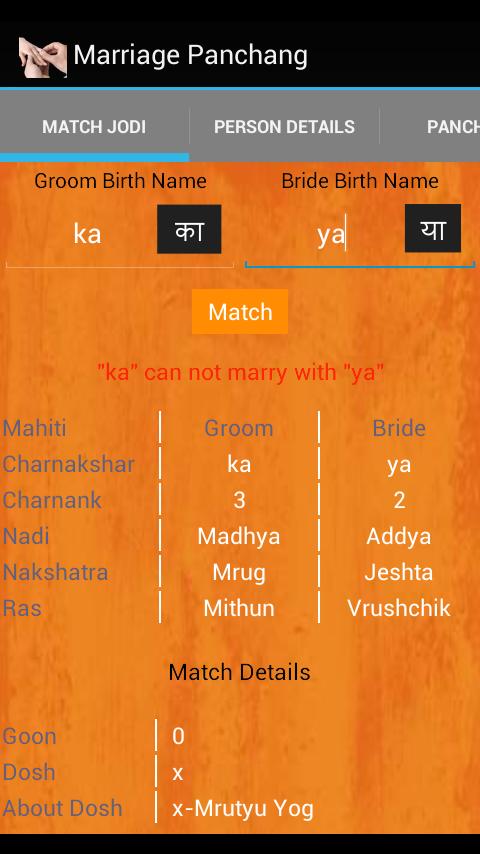 Puede obtener los datos personales para el novio y la novia. Necesita conocer su nombre de nacimiento antes de comenzar esta aplicación. Lista de aplicaciones Down the Permitir los nombres de nacimiento válidos (primer carácter, es decir, Charnakshar). Encuentra el matón dependiendo de los detalles de la novia y el novio recuperados, es decir, Nadi, Nakashatra, Ras, Charnank, Charnakshar, etc., le da la partida final junto con la cantidad de matones coincidentes y si hay algún dosh. Solo hay pocos Dosh que no permiten el matrimonio. Puede seguir el resultado de esta aplicación en algún nivel. Si desea los resultados de la coincidencia en profundidad, siga la fecha real Panchang.