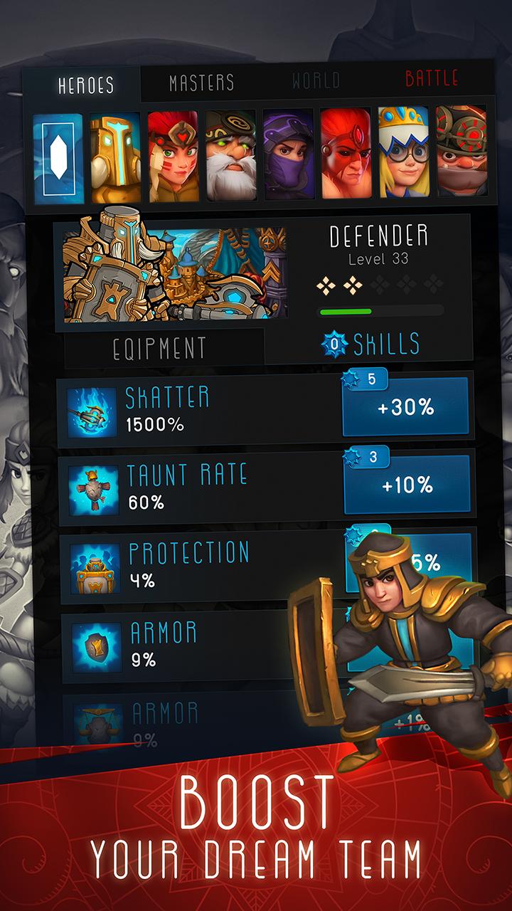 Mejore sus habilidades básicas y mejore a sus héroes. Revise las tácticas antes de las peleas con los jefes y actualice las habilidades requeridas. ¡La marea de batalla depende de ello!