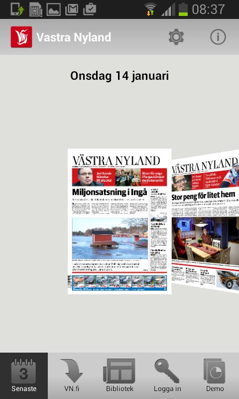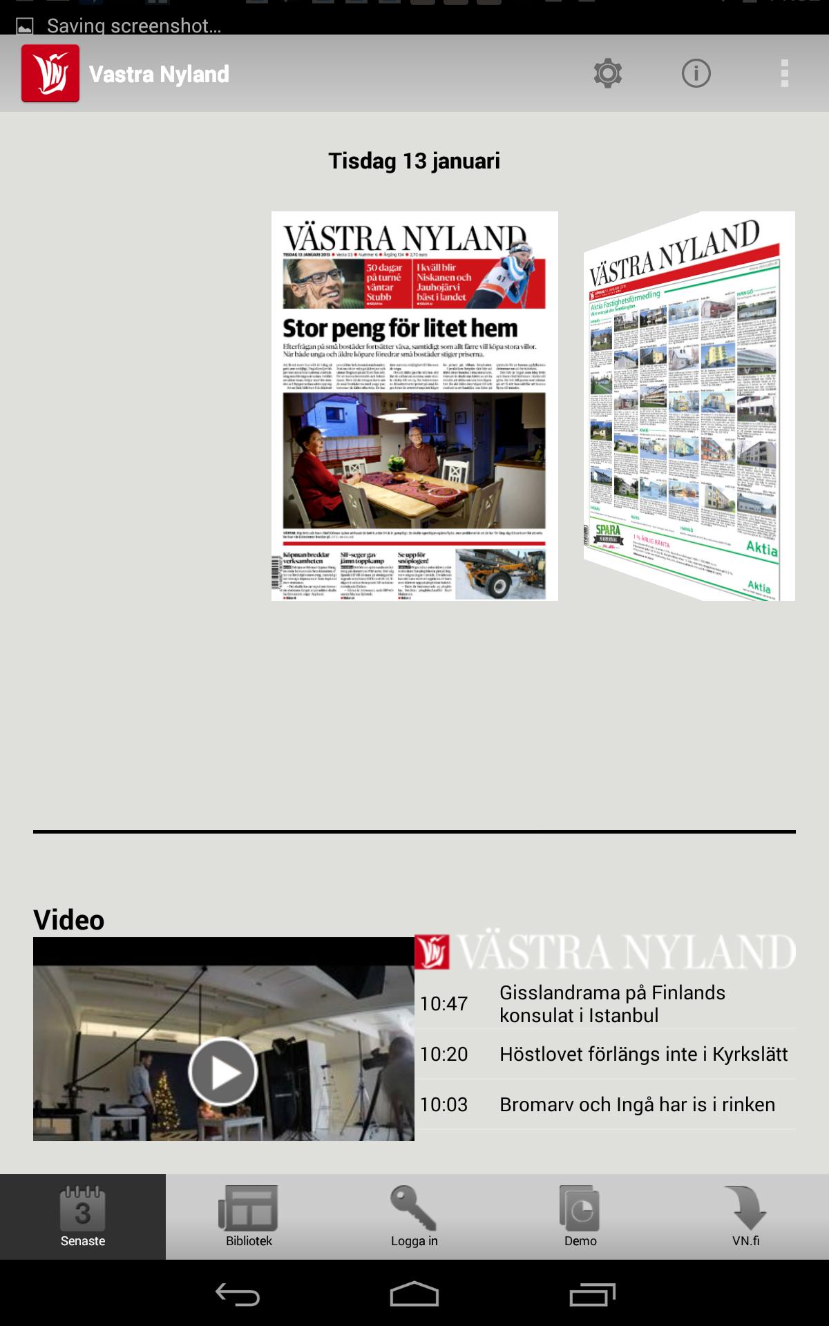 Western Uusimaa is the leading Swedish -speaking regional newspaper in Western Newland and is published five days a week. eVN for Android is a reader-friendly e-magazine that has the same content as the paper magazine. The app is free, but you must have a VN digital subscription or pay to get the content.
