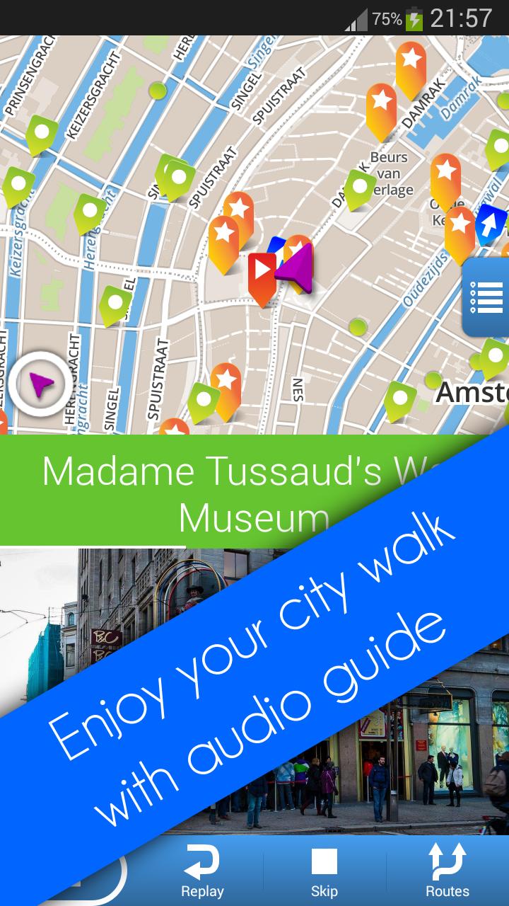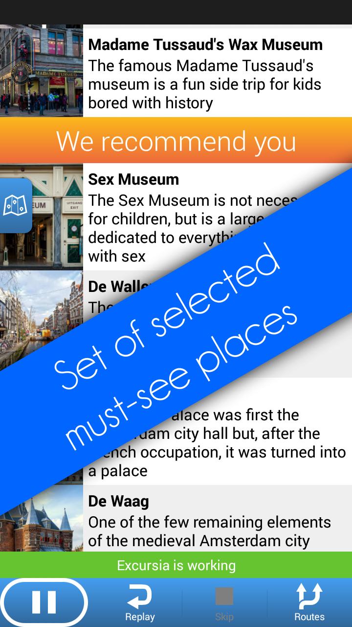 Enjoy Excursia audio guides. Available cities are: Amsterdam, Barcelona, Venice, St.Petersburg.