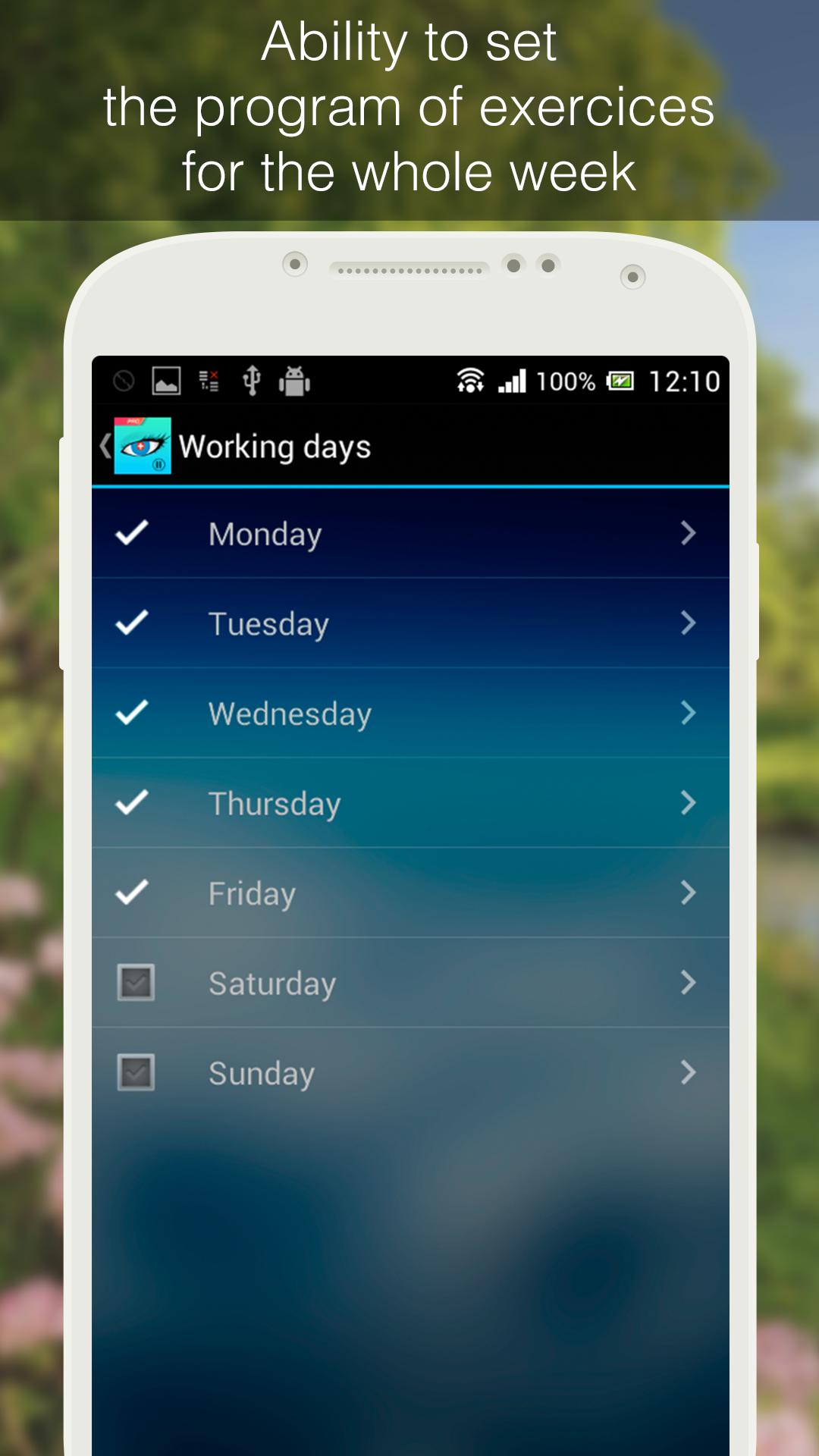 In order to do the exercises just in time, you have the opportunity to set the schedule for the whole week ahead. Meanwhile you will get not only exercises, but at the same time you will receive important tips for maintaining good eyesight.