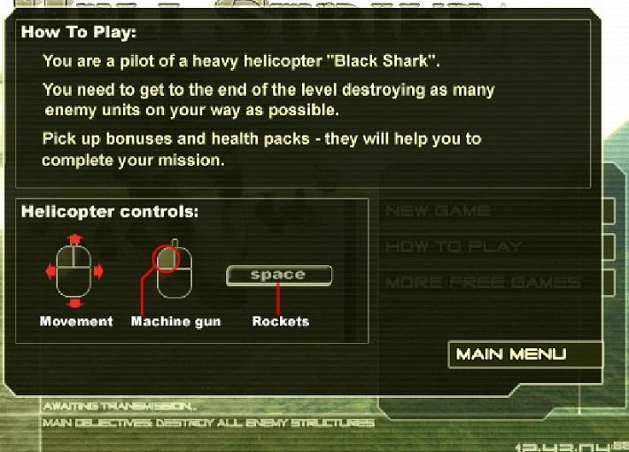 Pilot a helicopter Black Shark, destroy all enemies and rescue your agent.
