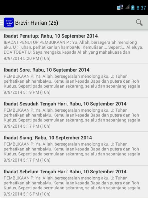 Brevir Harian Katholik est une application contenant 7 liturgies des heures (laudes, Vesperae, Hora Media; Tertia, Sexta, Nona, Completorum, Office lectionis) à Bahasa Indonésie. "Le but du bureau divin (bréviaire) est de sanctifier le jour et toute activité humaine ... c'est la prière non seulement du clergé mais du peuple entier de Dieu.-Constitution apostolique, canticum laudis.