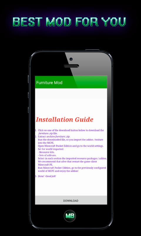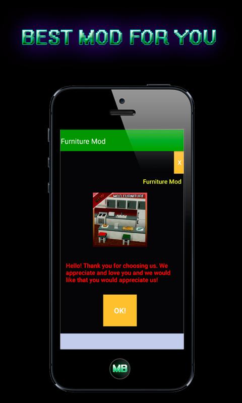 Cette application vous aidera à installer l'un des mods les plus populaires pour Minecraft Pocket Edition - Furniture.