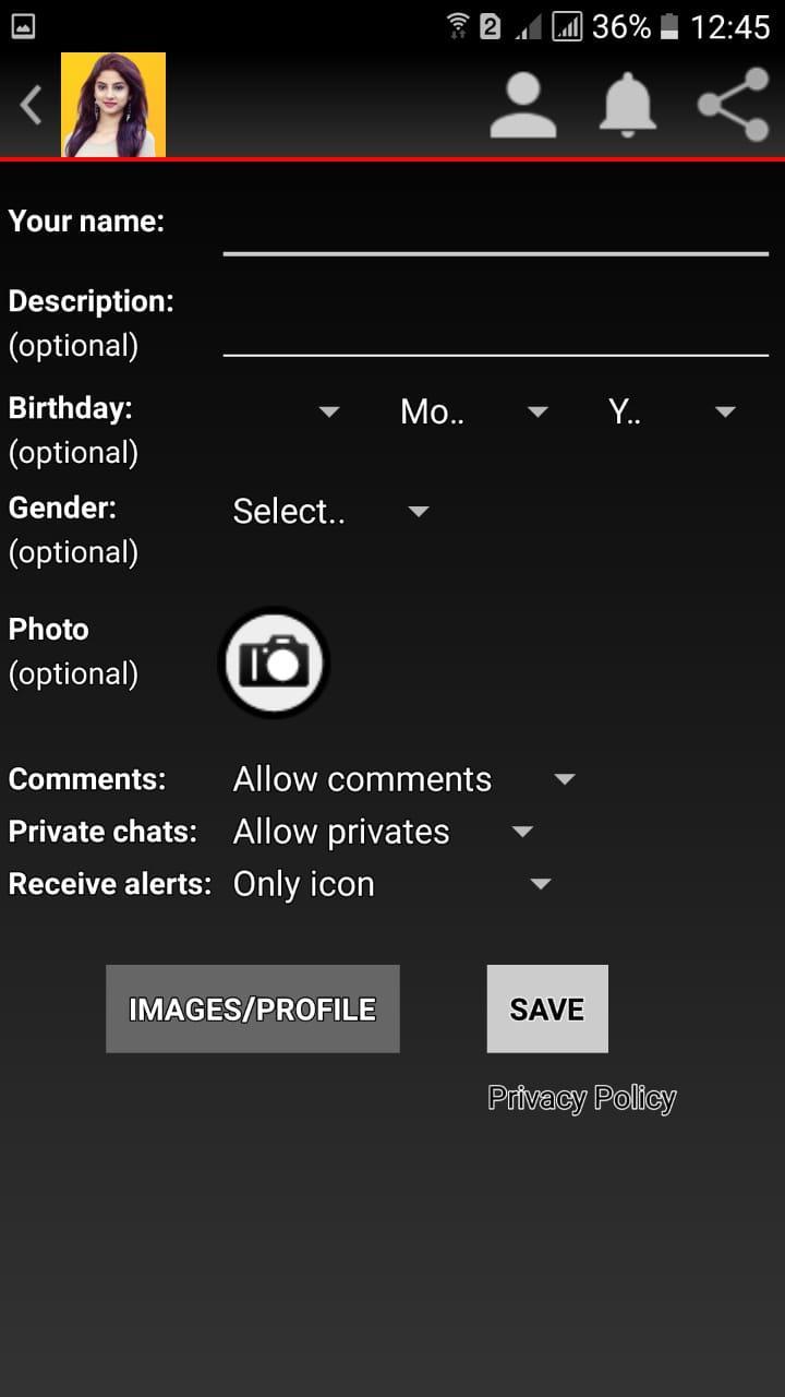 Eh bien, lorsque vous ouvrez l'application pour la première fois, vous pouvez soit vous connecter avec votre compte de conversation vidéo en direct des filles, soit remplir un formulaire de profil pour informer les autres de vous un peu plus sur vous. Les éléments du profil sont: nom, surnom, description facultative de vous-même, anniversaire, sexe et photo. Vous pouvez également spécifier si la réception de commentaires ou de messages privés est autorisé ou non ou si vous pouvez également vous connecter avec Google.