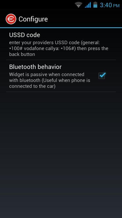 Lorsque vous mettez le widget sur l'écran d'accueil, une page de configuration apparaîtra, vous devez saisir le code USSD de votre fournisseur. Le code USSD pour la plupart des sociétés est * 100 #, par exemple pour Vodafone Callya est * 106 #.