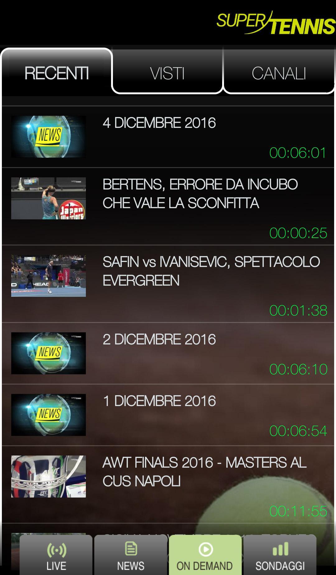 - À la demande: révision lorsque vous voulez les clips individuels des meilleures sections SuperTennis . Le talk-show de "Tennis Club", les interviews avec des gens célèbres de "I and the Tennis", les colonnes locales "la voix des régions" et "circulant", l'étude médicale du "tennis et de la médecine" et bien d'autres.