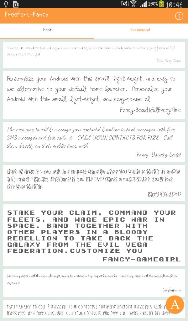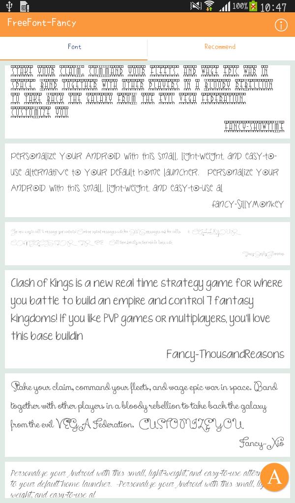 FreeFont - Fancy has a variety of fonts to choose from and we will install more handpicked fonts on your Samsung Galaxy or HTC often.Please browse through our FreeFont - Fancy packs to find the perfect freefont styles that fits your taste. however the typefaces used on your device will not be sent to people that you send a text message to.The FreeFont - Fancy is also designed to be compatible with Monotype Imaging Inc.'s FlipFont® program . The FreeFont - Fancy Pack is also designed to support CM Launcher & Solo Launcher and will allow the user to import the included fonts into the CM Launcher & Solo Launcher Application.NOTE: This App is NOT sponsored, endorsed, or affiliated with Monotype Imaging, Inc, the owner of the FlipFont® trademark and technology or affiliated with CM Launcher & Solo Launcher .Please enjoy your freefont for texting and messaging. All of our typefaces are free.In the display settings you can change the freefont style to any of these 25 new freefonts for Android.