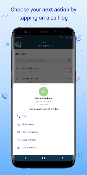 Follow up actions Tap on an item in your call history to return the call or view the call summary, notes and play the recording.