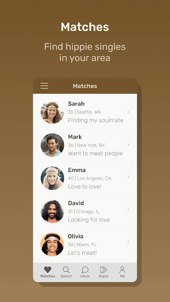 - Search: Only want to date people near you? Use the Search feature to find matches based on specific criteria such as location and age. For example, you can search for Hippies who are over 30, over 40, over 50, or over 60