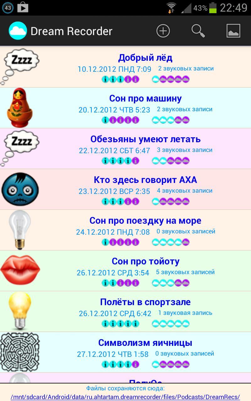 Dalam aplikasi ada 2 cara untuk memasukkan informasi: teks dan suara (perekam suara). Bangun di malam hari, Anda mungkin tidak ingin menyalakan lampu, mengambil pena dan menulis mimpi di buku catatan. Dengan aplikasi ini, Anda dapat memutar mimpi di keypad telepon, sambil mendikte perekam. Kemudian, Anda dapat mendengarkan catatan ini dan mengetik ulang teks. Rekaman suara disimpan melekat pada rekaman adalah impian yang mereka hubungkan.
