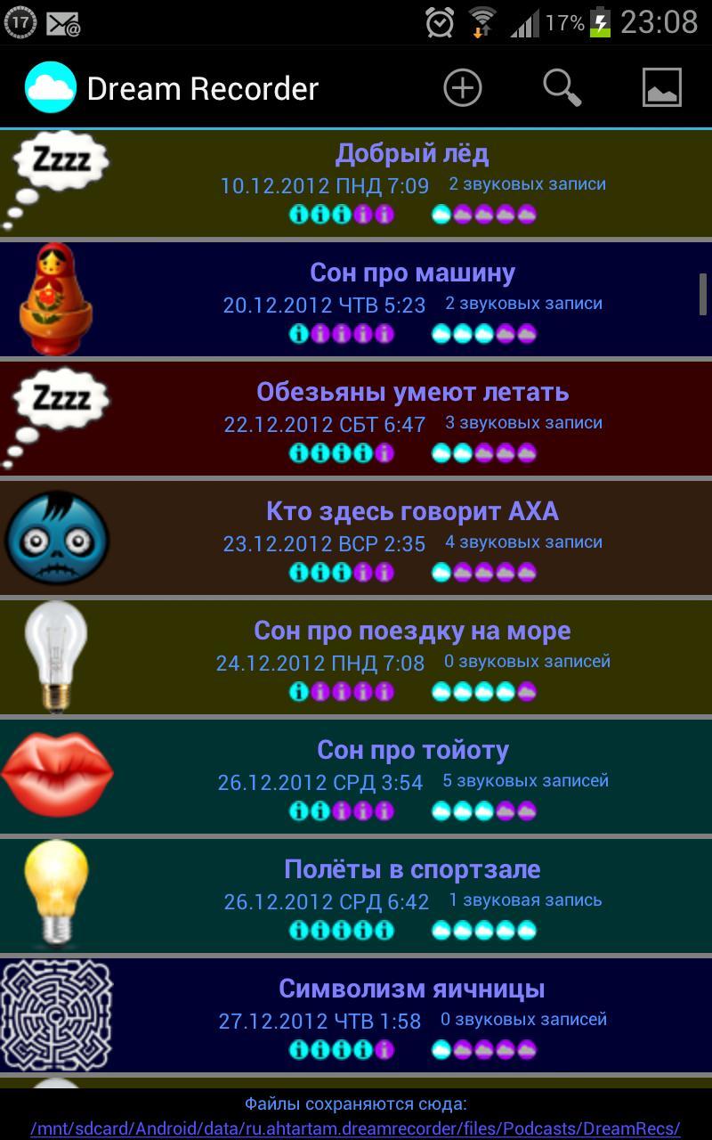 Memberikan fungsi mimpi dalam file XML ekspor, yang nantinya dapat dikonversi ke format yang benar (misalnya, untuk mengimpor ke aplikasi lain untuk merekam mimpi). Rekaman suara ada di folder publik yang dapat Anda salin ke komputer Anda.
