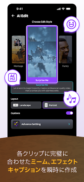Langsung mengedit sorotan menjadi klip yang dapat dibagikan dengan AI edit. Tambahkan meme, efek suara (SFX), efek visual (VFX), dan keterangan dalam detik untuk membuat konten Anda menonjol.