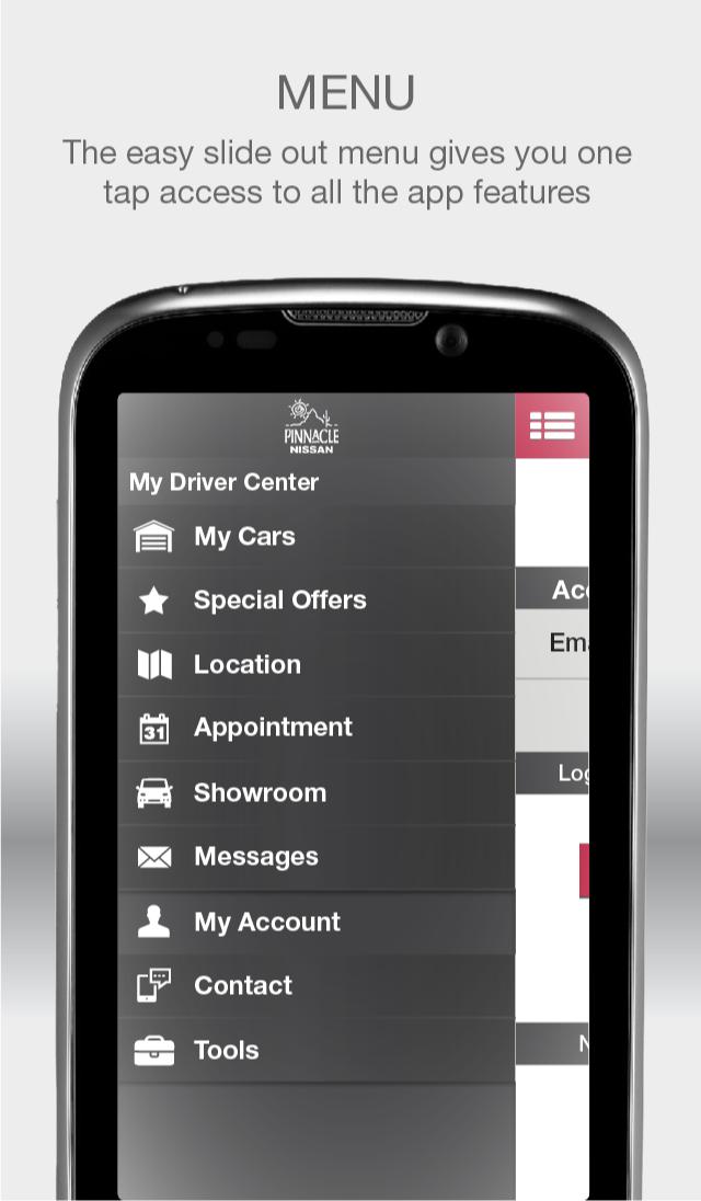 Buat pengalaman kepemilikan kendaraan Anda mudah dengan aplikasi seluler Pinnacle Nissan GRATIS. Aplikasi kaya fitur ini memungkinkan Anda untuk mendapatkan hasil maksimal dari kendaraan Anda dengan membantu Anda memelihara dan mengatur detail mobil penting seperti riwayat layanan, serta menghemat uang dengan penawaran seluler dan kupon!