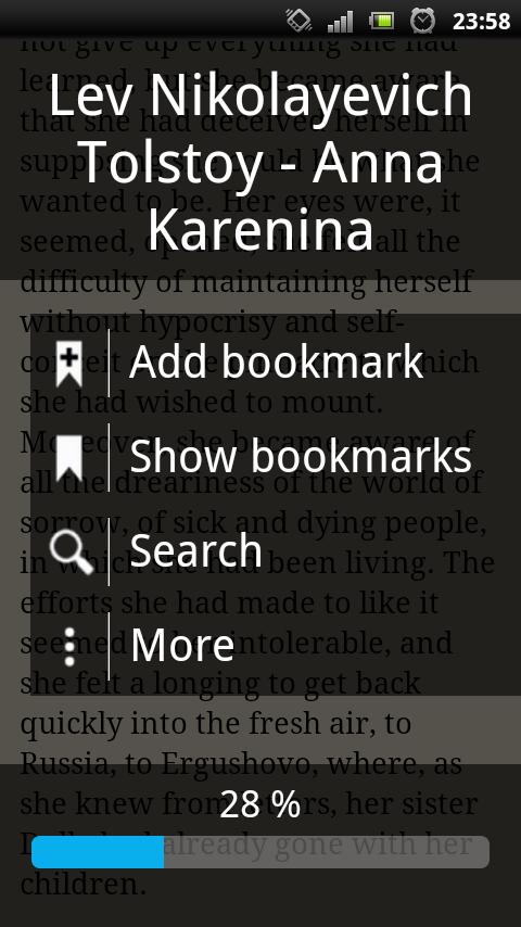 Saat membaca buku, seret ke atas atau ke bawah di sepanjang tepi kiri layar untuk meningkatkan atau mengurangi kecerahan. Seret ke atas atau ke bawah di sepanjang tepi kanan layar untuk menambah atau mengurangi ukuran font. Ketuk di tengah layar untuk memunculkan layar informasi, di mana Anda dapat melompat ke posisi di buku menggunakan bar seek di bagian bawah. Ada juga opsi untuk bookmark dan mencari teks tertentu. Layar informasi juga dapat dicapai dengan menekan tombol menu pada perangkat Anda.