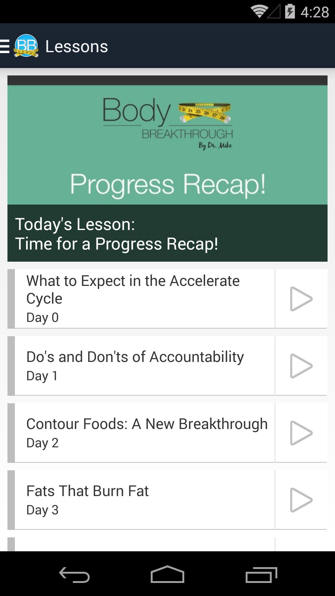 ****このアプリは、ボディブレークスルーの顧客専用です。ボディブレークスループログラムを購入していない場合は、www.drmikediet.com/the-17-diet/body-breakthrough/sp/body-breakthrough-bridge.htmlをご覧ください****