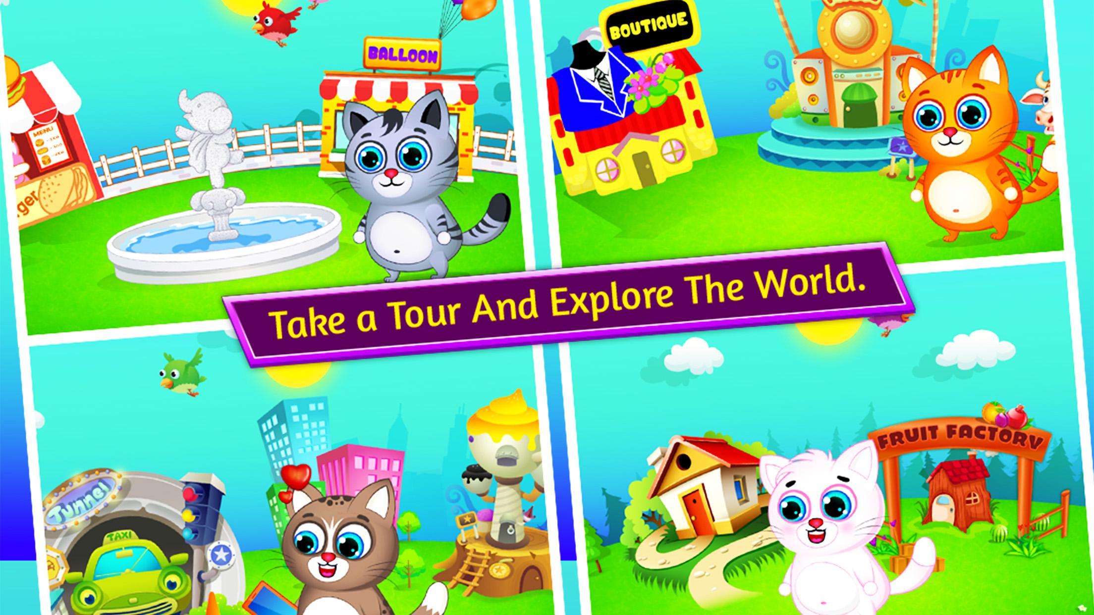 あなたのペットの美しい世界にツアーに参加し、多くの冒険好きな活動を探索してください!子猫と一緒に30のユニークなミニゲームをプレイし、コインを獲得します。これらのコインを使用して、子猫のペットのためにさまざまな食べ物、衣服、ポーションを購入します。あなたのペット農場を訪れて、農場の新鮮な野菜や果物を育ててください。彼女がファッションをするのが大好きなので、あなたのバーチャルキティのスーパーマーケットストアにアクセスして、彼女の新しいサロンルック&スタイリストの服を贈ってください。子猫のレストラン&ベーカリーを訪れて、ハンバーガー、ピザ、フライドポテト、ケーキ、ドーナツ、カップケーキ、果物、野菜などを購入してください。