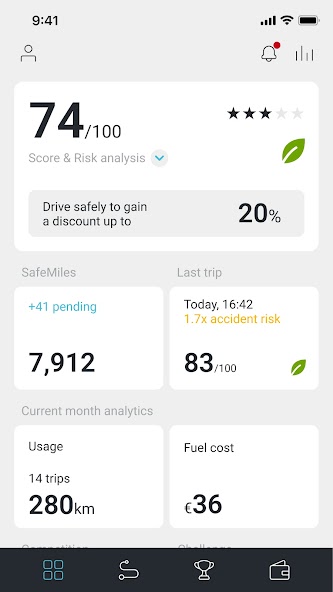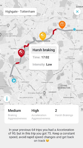 •スピード違反、モバイルの使用(注意散漫な運転)、および攻撃的な運転のレベルに基づいてスコアを取得する(厳しい加速と過酷なブレーキング)