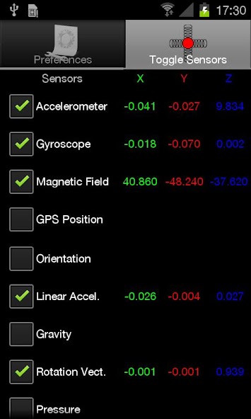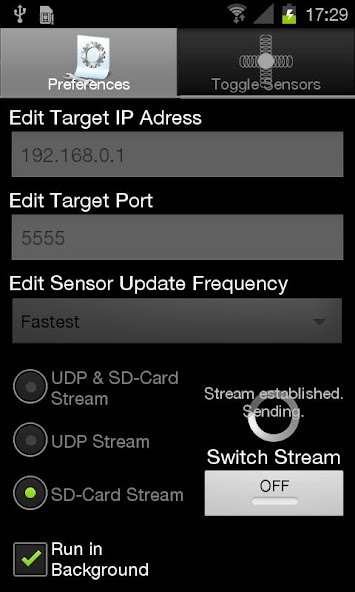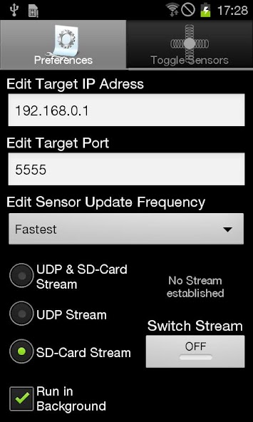 スマートフォンのセンサーデータを取得し、SDカードまたはクライアントにストリーミングします。