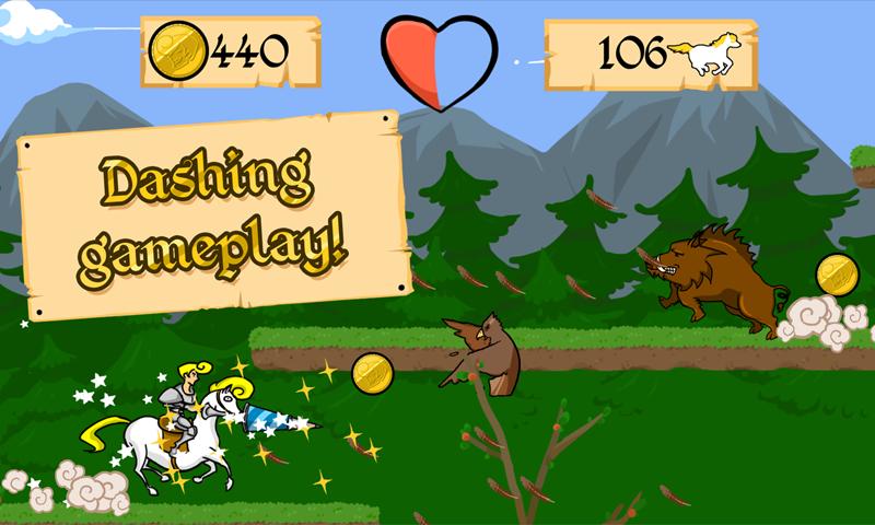 王女は捕らえられており、それはSir Dashingと彼の信頼できる馬の仕事であり、彼女をいくつかのお茶のために連れ戻すことです。障害物や敵を飛び越えて、ランスを使ってダッシュ攻撃を行います。オークの土地に向かう途中でコインを集めて、新しい服装や武器を購入してください。