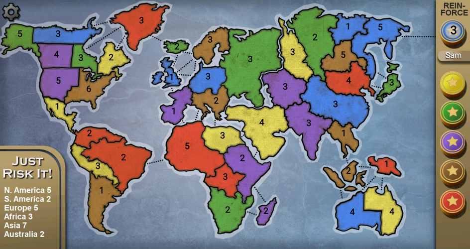 Just Risk It is a game of chance and strategy, similar to the classic board game of Risk. The goal is to gain territory by attacking your opponents, and eliminate them one-by-one. The last one remaining is the winner.