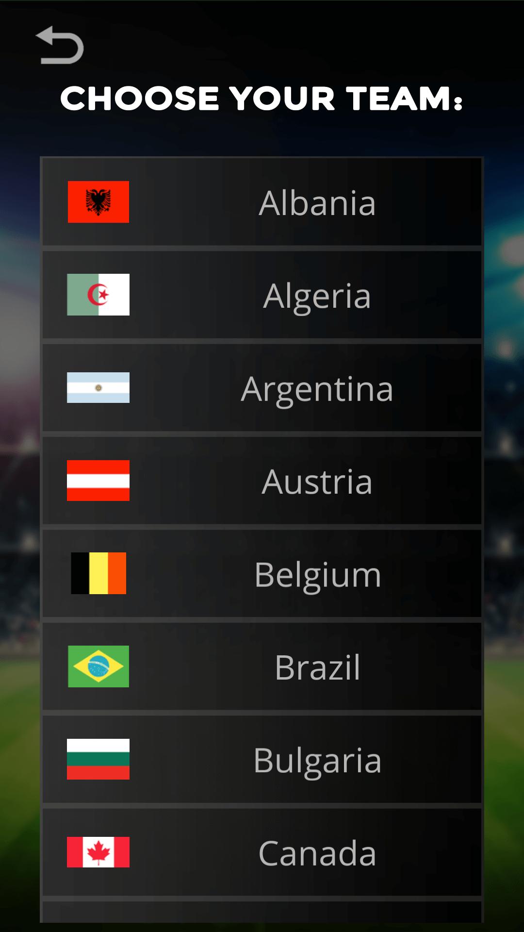 Choose your country : a glorious national team like Brazil, Argentina, Germany (Uber Alles), Italy (Squadra Azzura) , England and France or a fresh and ambitious one like USA ( United States ) , Iceland, Poland, Nigeria, Japan, China.