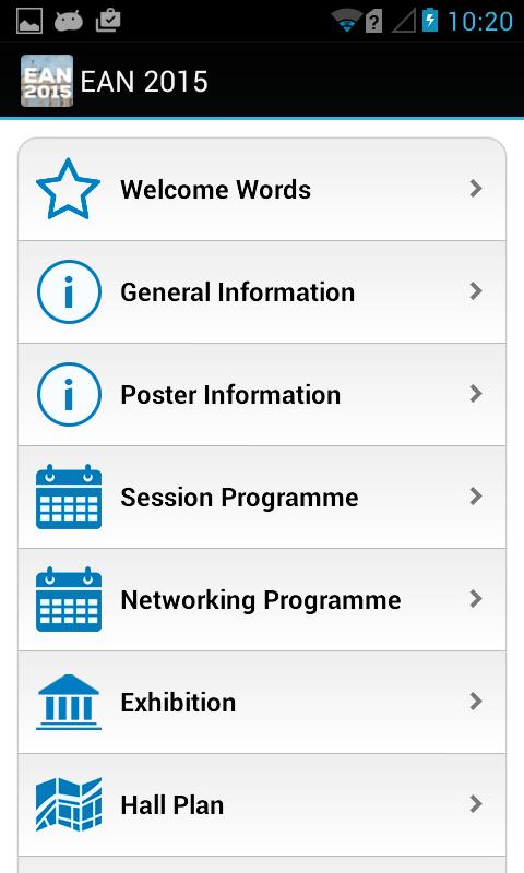 EAN 2015 Congress App은 유럽 신경학 아카데미 의회를 통한 동반자입니다. 쉬운 탐색 및 완벽하게 필터링 된 내용은 세션 이름, 세션 및 룸 번호, 시작 및 종료 시간을 포함한 빠른 프로그램 개요를 지원합니다. 평면도는 기술 전시회를 통해 길을 찾거나 전시 회사에 대한 정보를 얻는 데 도움이됩니다. 이 앱은 또한 다음과 같은 기능을 다룹니다. IPP- 대화식 프로그램 플래너, 포스터 전시회 정보, 일반 정보 및 CME 인증 정보와 같은 기능도 설명합니다.