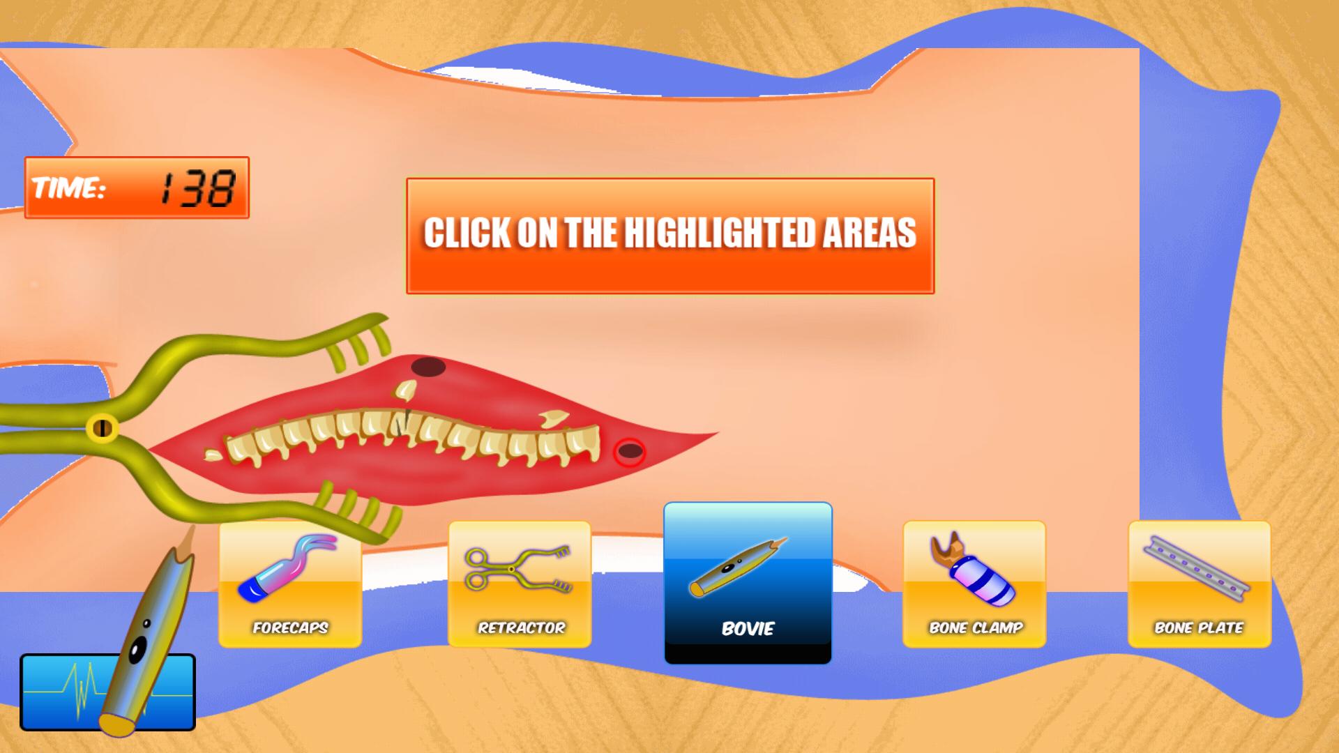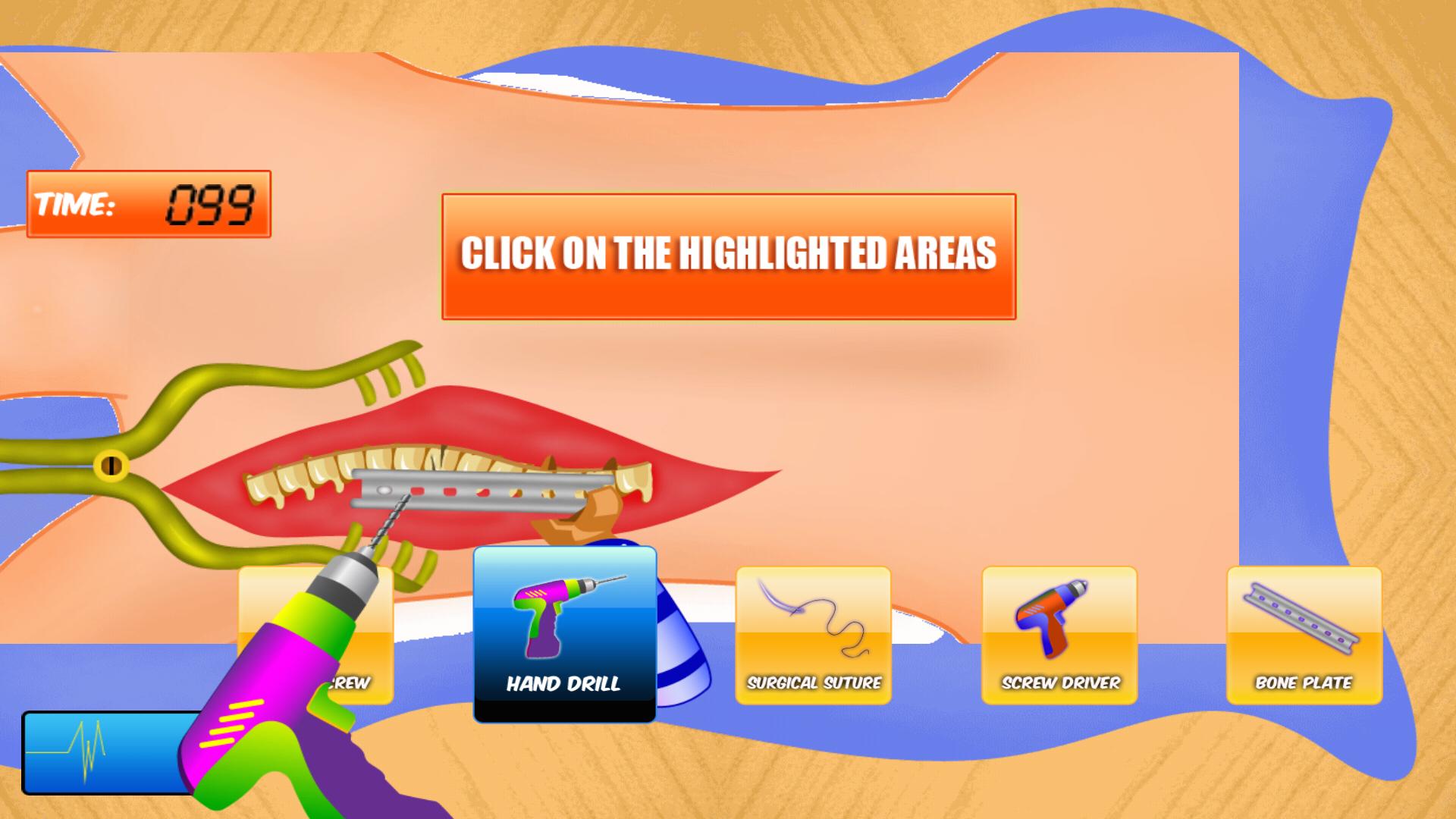 이 극장에서는 성공적인 수술에 필요한 모든 것을 찾을 수 있습니다. 상처가 열리고 철 접시를 넣고 나사를 놓고 상처를 꿰매고이 게임을 성공적으로 끝내십시오. 그래서 당신의 환자들은 행복 할 것입니다. 당신은 시도하고 싶습니까?