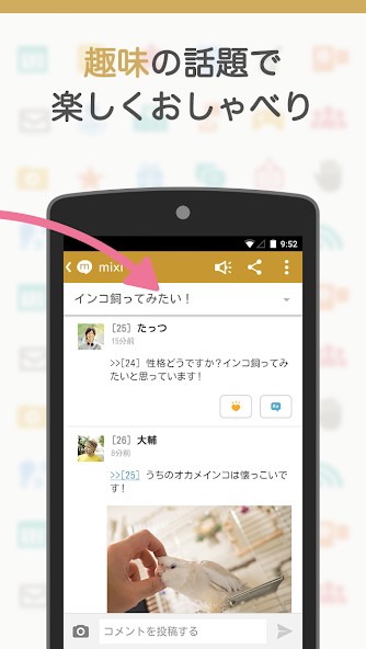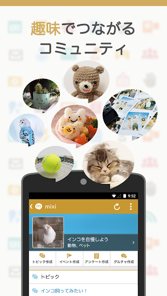 mixi is a social networking service where everyone can talk about their own hobbies.