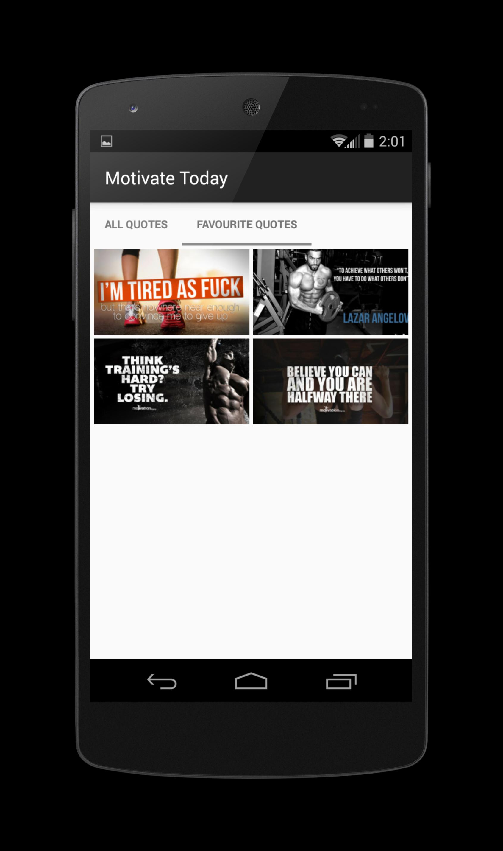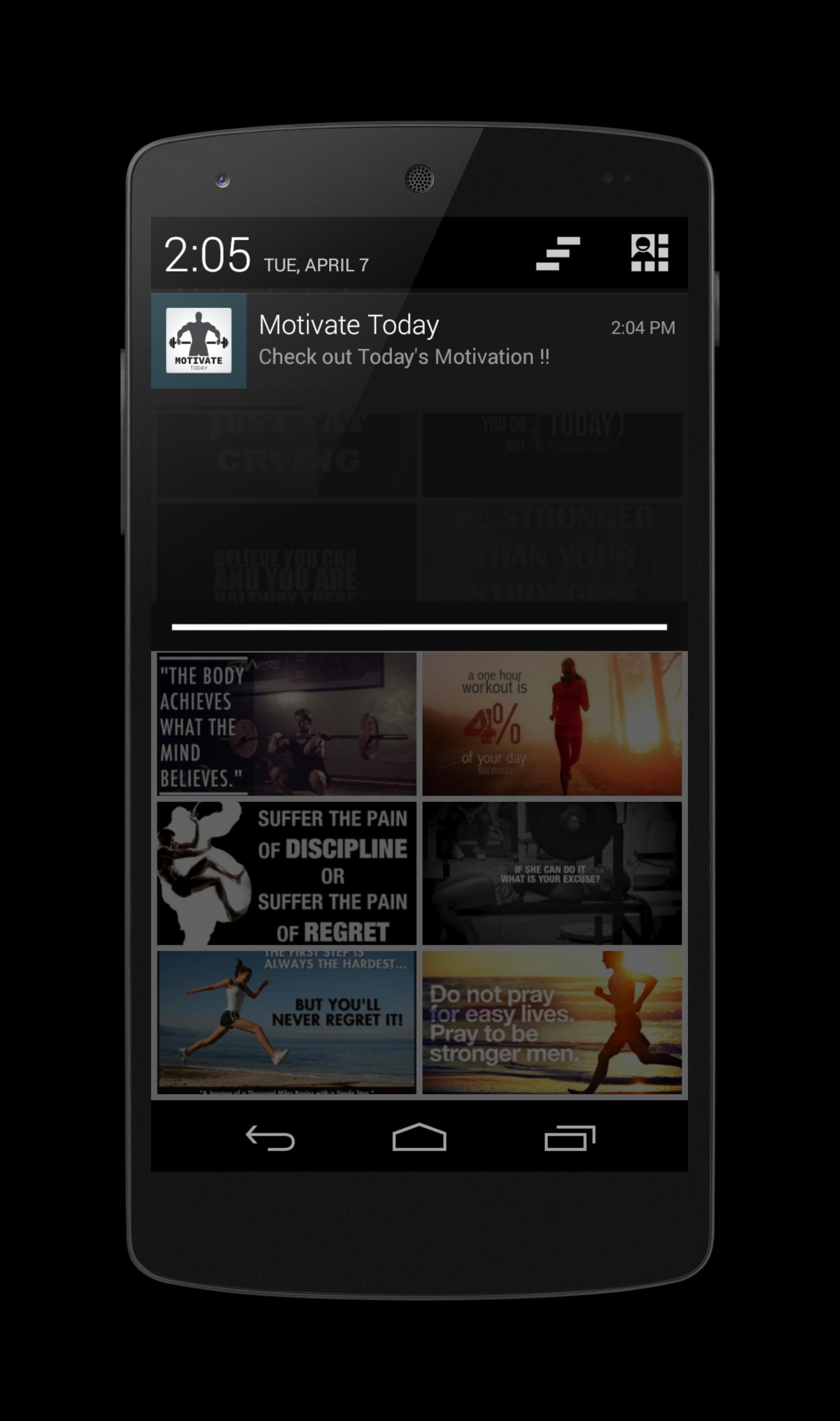 This app contains best motivation quotes for you. And you will receive world top rated motivation quotes by push notifications Everyday for FREE. Also You can favorite motivation quotes and share with your friend using Facebook, Twitter , Google+ , and other sharing apps you have on your android device.