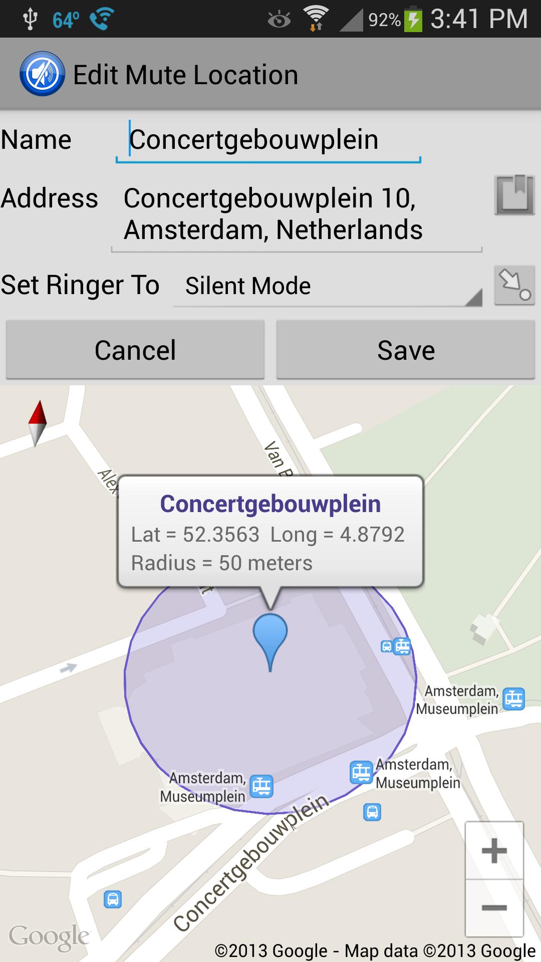 You can also use Mute Pro to put your phone to silent mode when you enter a specific location. Your phone's ringer will be automatically restored to normal mode when you leave that location.