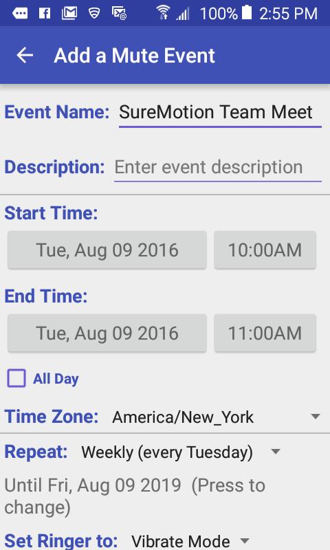You can enter the times manually or let the application import the times from events/appointments in your calendar. Your phone's ringer will be on mute automatically only when those times occur.