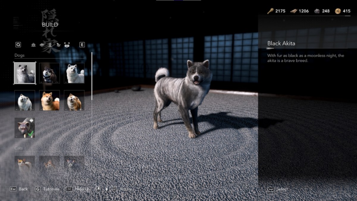 Go into the Hiroma and approach the bench to make improvements to the Hideout. Once you’re in the customization menu, enter build mode. Tab over to the wolf icon on the far right. This will list all of the animal types you have unlocked, separated into dogs, cats, and “other.”
