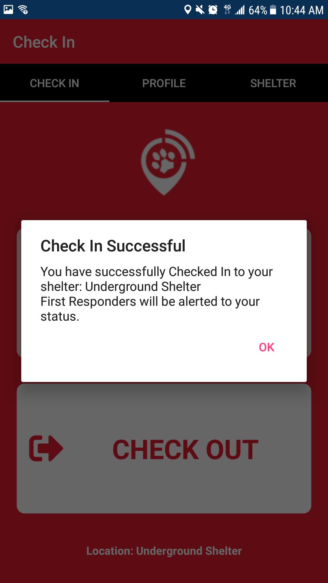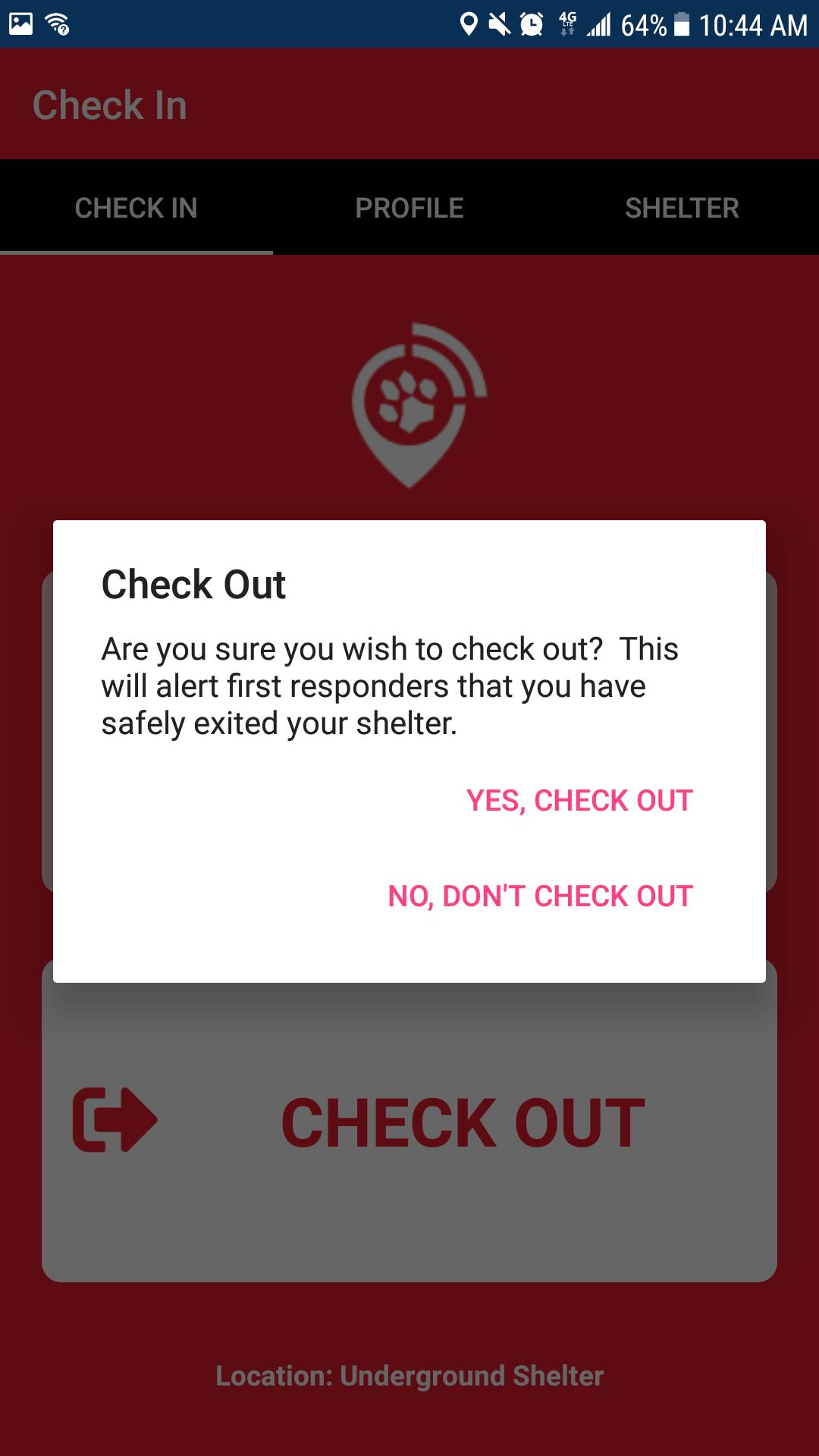 If the storm threat expires or you are safe, you will be prompted to “check-out” of your shelter through the app. This will remove you from any list given for search and rescue.